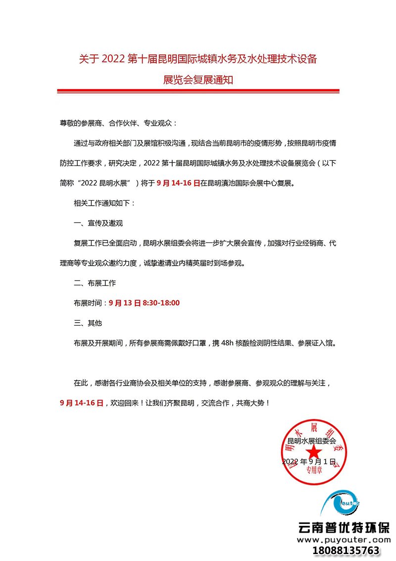关于 2022 第十届昆明国际城镇水务及水处理技术设备展览会复展通知