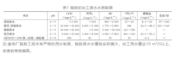 (1)咖啡清洗废水,约占比2/5,颜色灰黑色,水中含有大量灰尘、腐叶等,SS较大,有机污染物来源于腐烂、破损的咖啡豆,COD等污染物含量与循环使用次数有关,通常小于1 000mg/L;