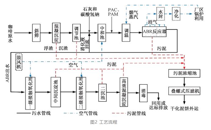 (2)咖啡初加工废水总体上属于可生化性废水,其净化应考虑预处理+厌氧消化+好氧氧化+三级处理的净化生物路线。依据其路线,结合工程实际案例,采用斜筛筛分去壳-混凝沉淀-中和-调温-ABR厌氧消化产气-二段生物接触氧化-高效混凝沉淀-次氯酸钠消毒组合生物,可有效去除污染物,出水水质稳定达标。