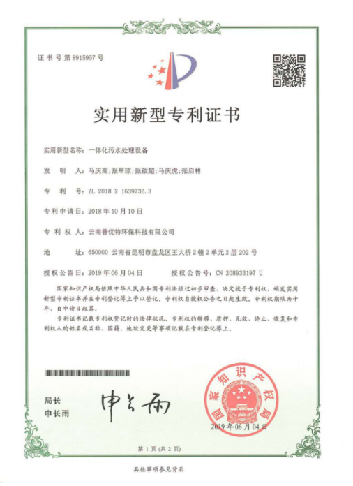 1、 专利技术(一体化污水星空足球-星空(中国) ZL 2018 2 1639736.3)