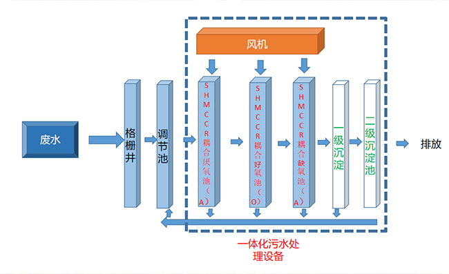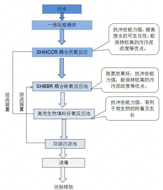 一体化高效生物反应污水处理设备生物为:SHMCCR耦合厌氧池(A)+SHBBR耦合缺氧池(A)+高效生物填料好氧反应池(O)+双级沉淀池+消毒